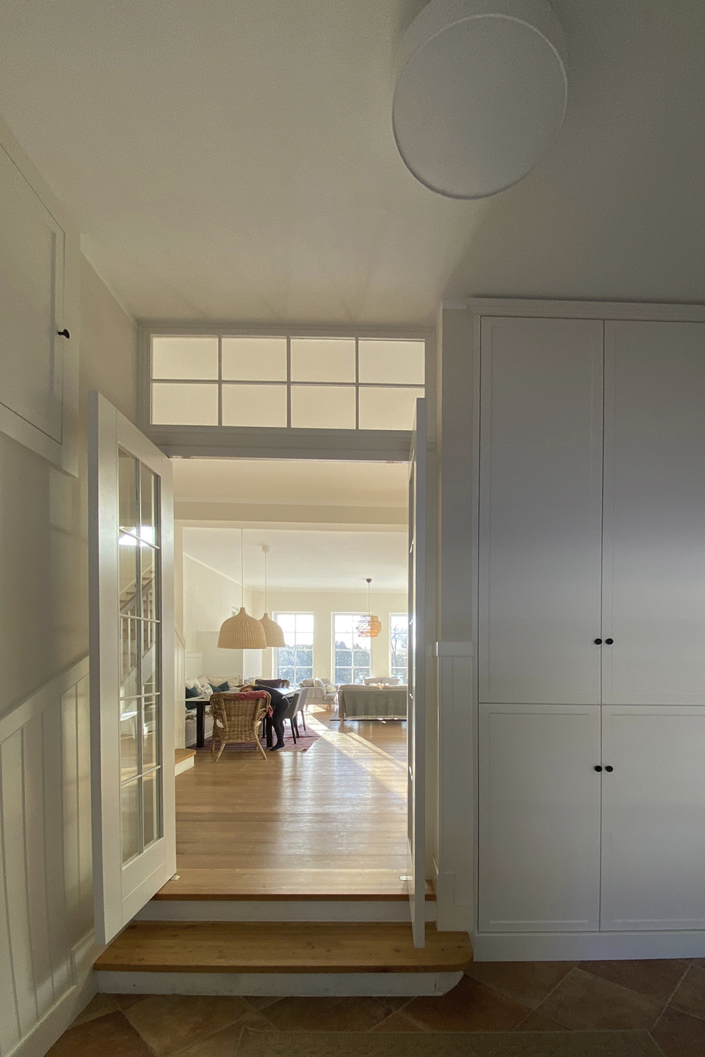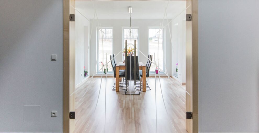 Hier wurde eine Friesglastüre mit Querfräsungen und satinierter Verglasung eingebaut. Ins Esszimmer führt eine Friesglas-Schiebetür mit Taschenverkleidung.