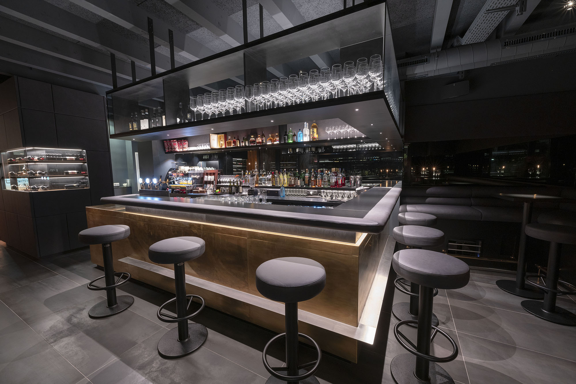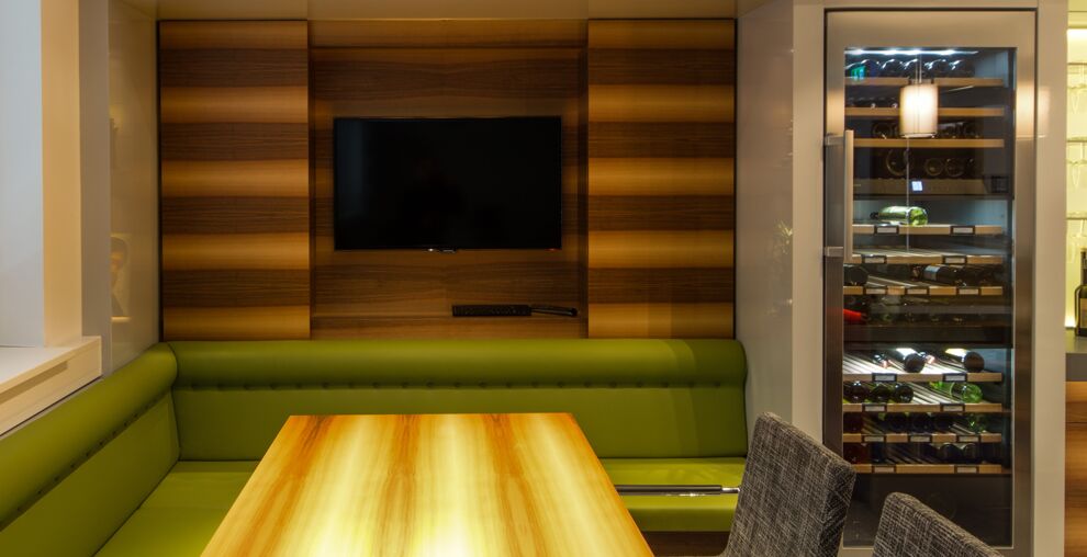 Hier entstand ein Besprechungsraum mit einem Barelement, einer Nische mit verstecktem TV und einer Weinkühlschrank-Einhausung.