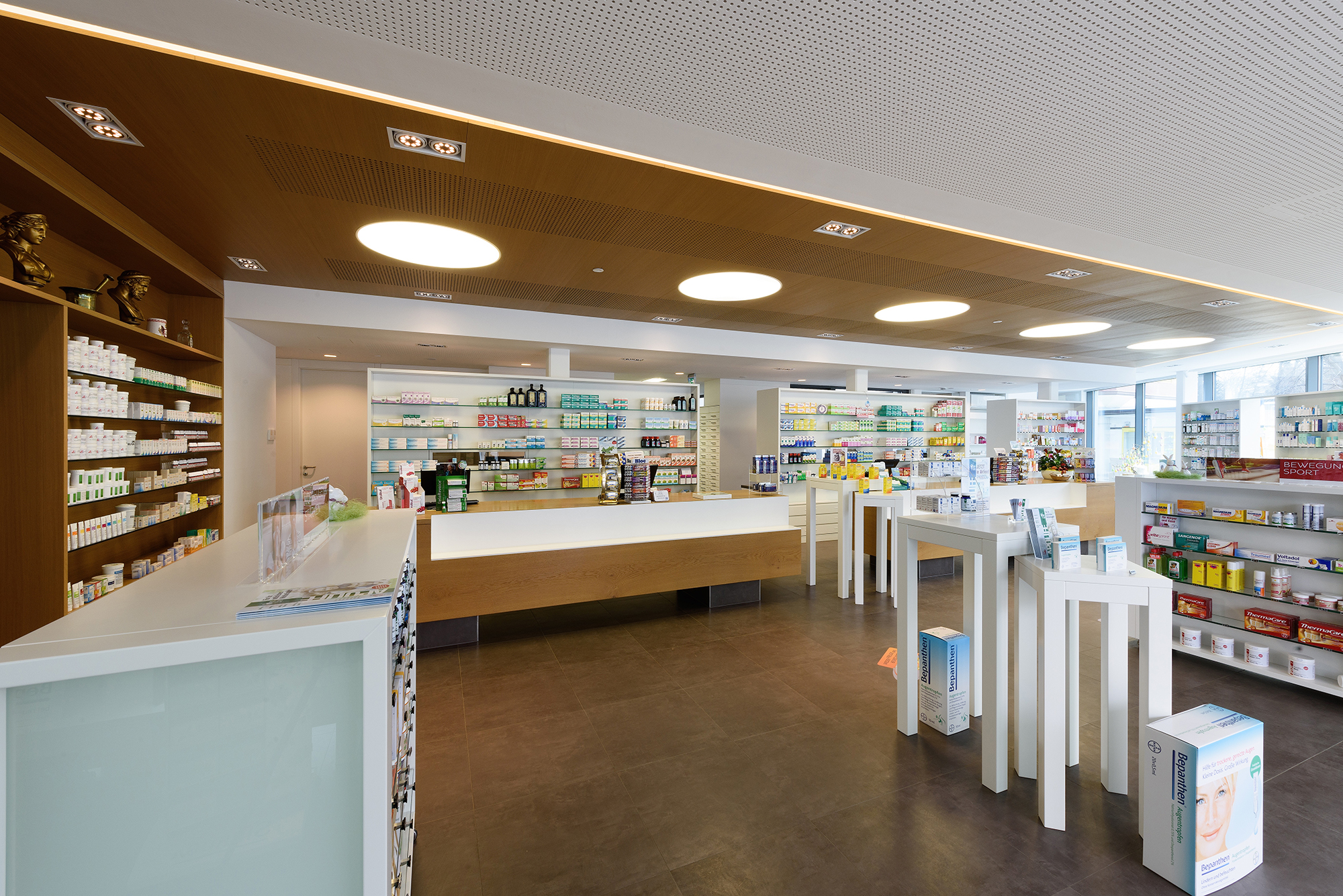 Die gesamte Einrichtung des Geschäftsbereichs mit Regalen, Gondeln und Verkaufspult, Deckengestaltung, Arbeitsplätzen, Labor, sowie Ladensystem wurde mit den Eigentümern und in Zusammenarbeit mit einem Architekten geplant.
