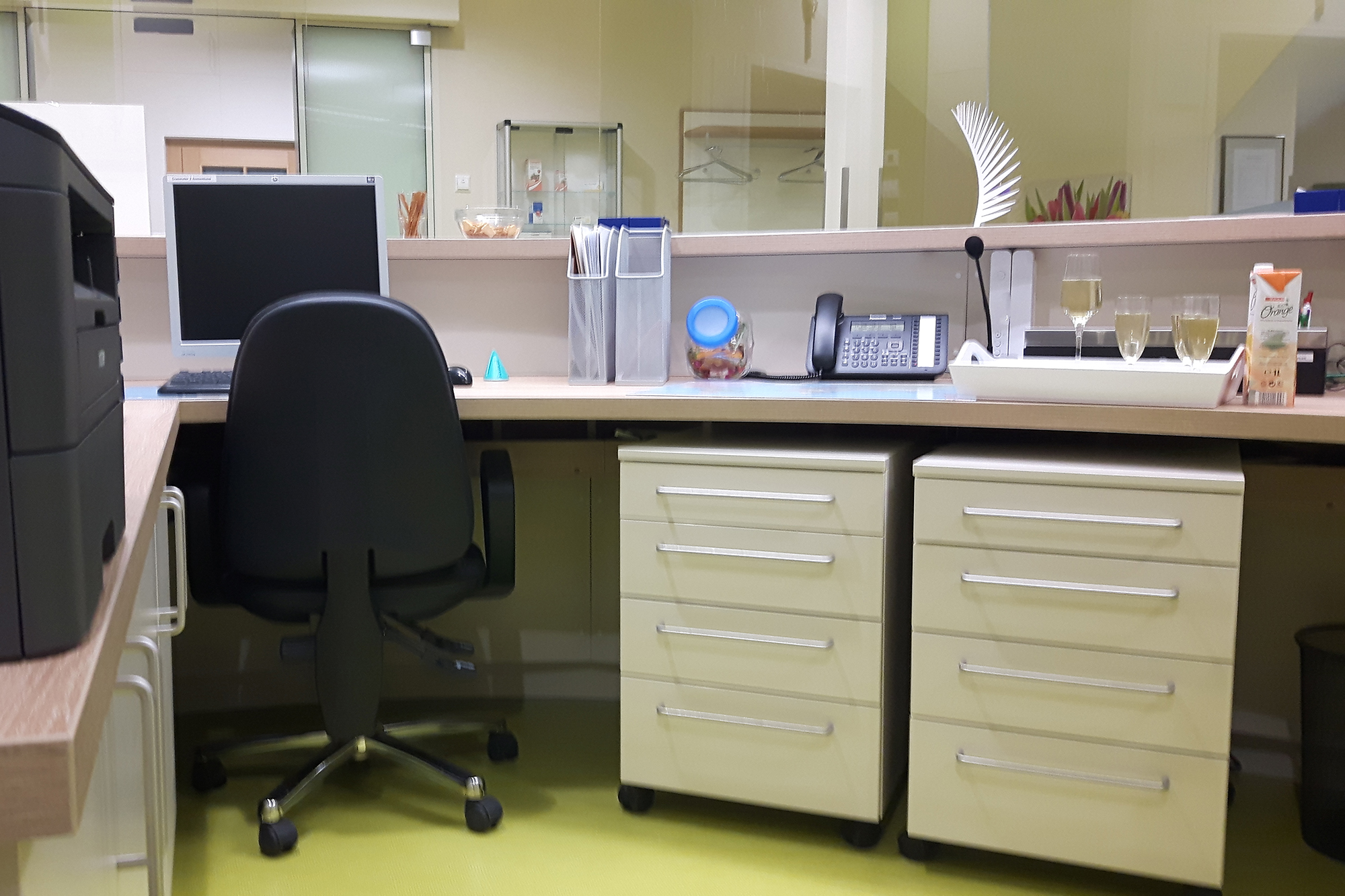 Die moderne Ordinationseinrichtung, bestehend aus dem Empfangsbereich mit großzügigem Empfangspult, viel Stauraum und Ablagefläche, dem Labor aus beständigem Material und funktionalen Möbeln und der Ordinationen mit Schreibtischen und Beratungsbereich erfreut die Patienten/innen in Karlstein.