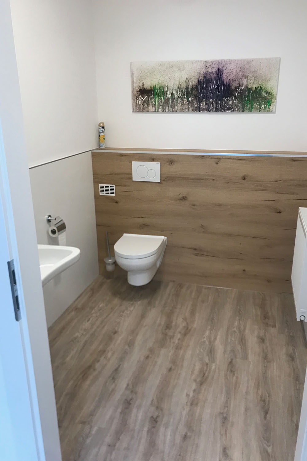 Der Schankbereiche, Wein-Vitrinen, Bänke und Stiegenwandlauf 3D und Netzverspannung, WC Trennwände, Innentüren und Waschtischunterschränke, Extrazimmer mit Wandverkleidung in Hackeiche, Massivholztische und Linoleumeinlagen - alles aus einer Hand.